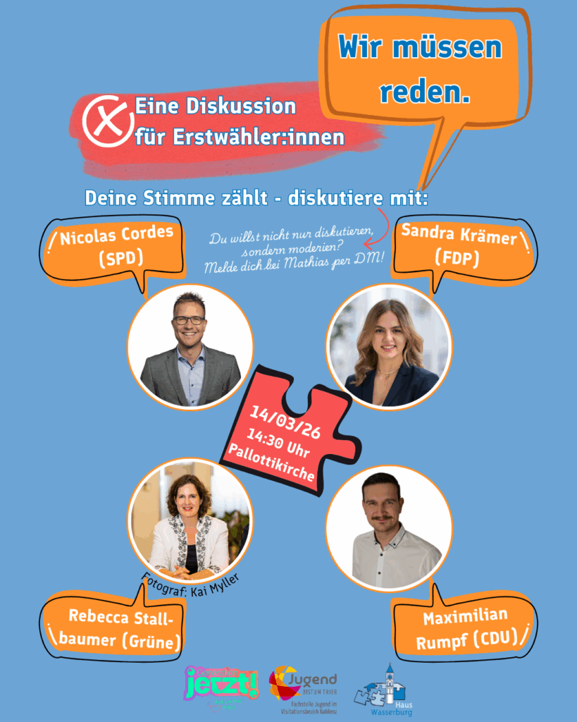 Haus Wasserburg und die Fachstelle Jugend im VB Koblenz bringen dich zusammen mit Nicolas Cordes (SPD), Sandra Krämer (FDP), Rebecca Stallbaumer (Grüne) und Maximilian Rumpf (CDU) .